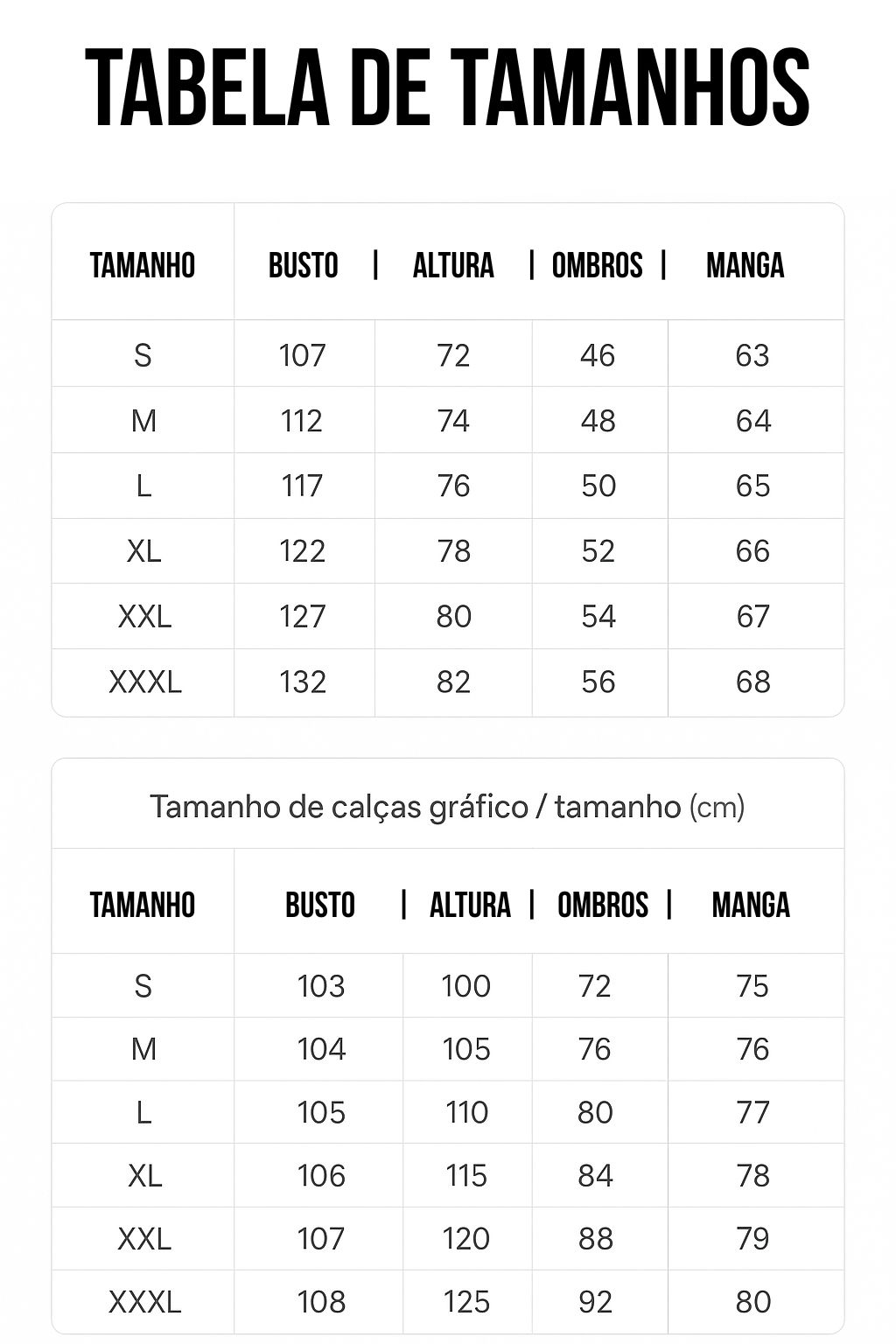 Tabela de tamanhos: